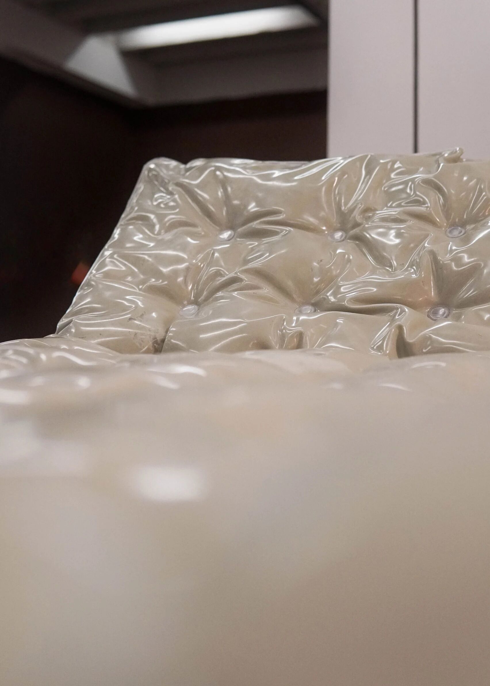 The “Soft Soil Daybed,” unveiled at the Collectible design fair in Brussels, began with clay salvaged from Paris construction sites. The clay was refined, mixed with water, and filtered before being piped into a clear plastic sheath and vacuum-sealed to retain its water composition.